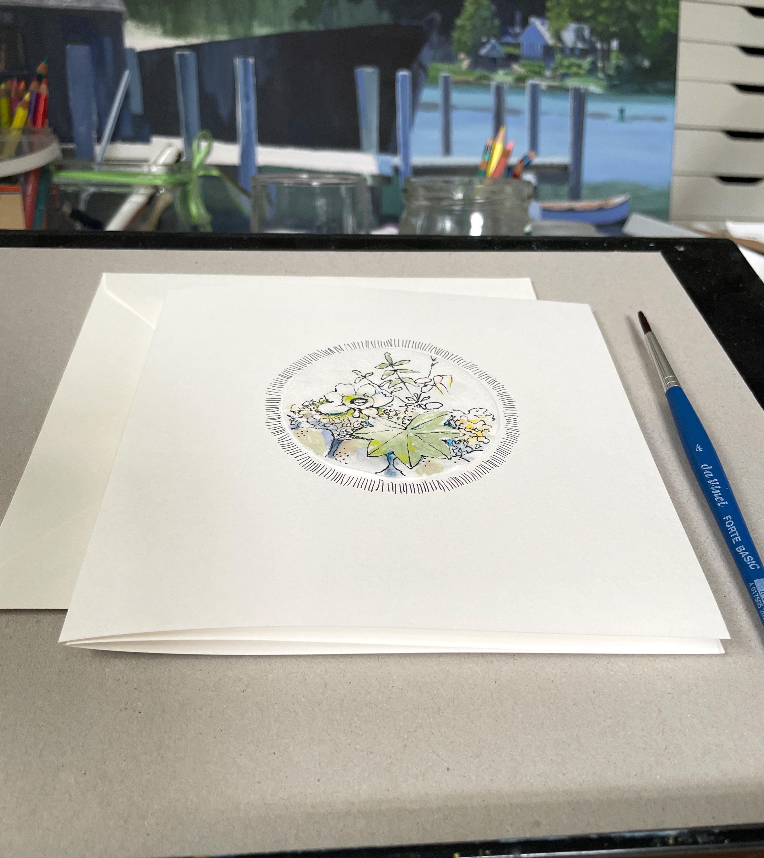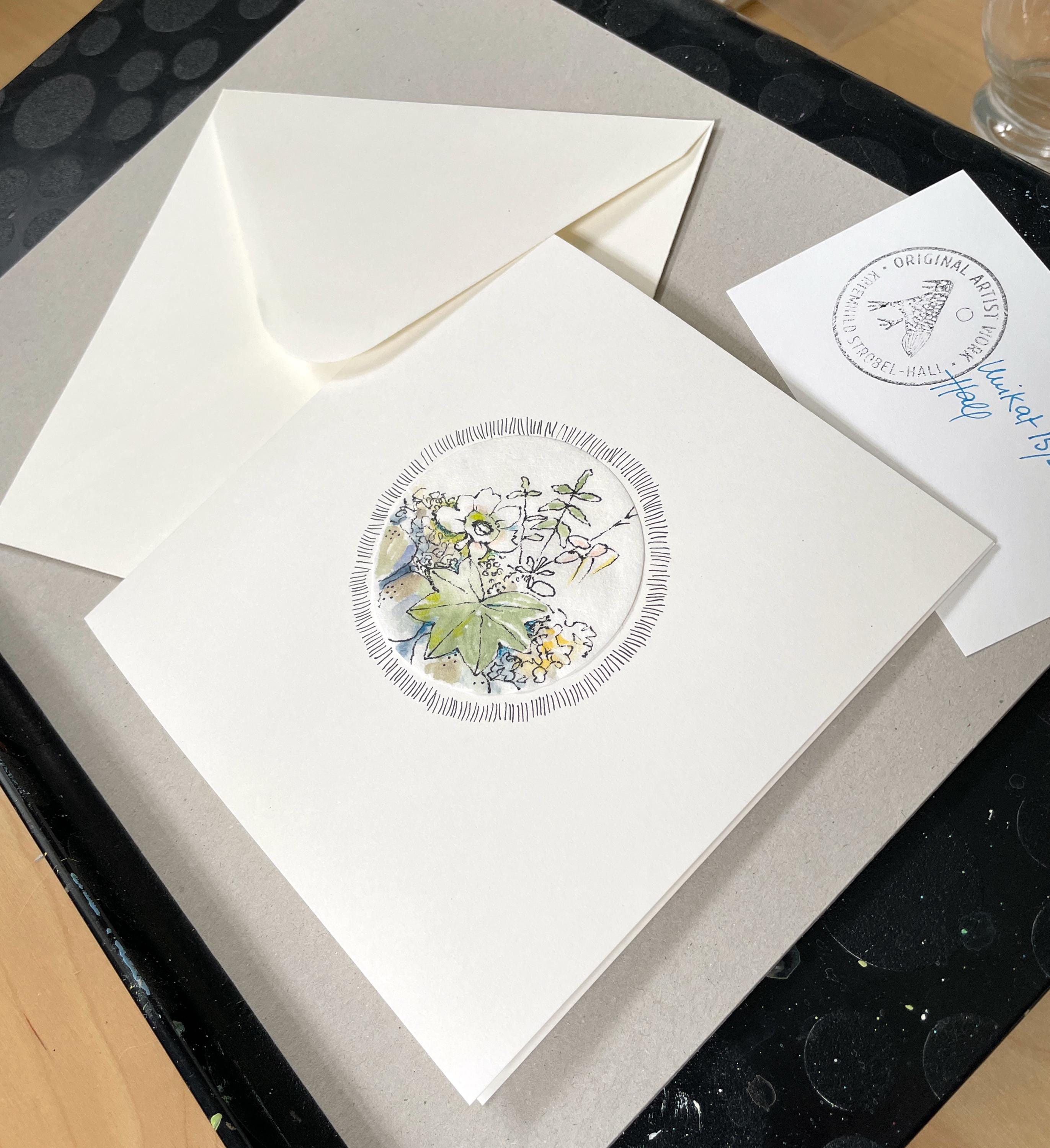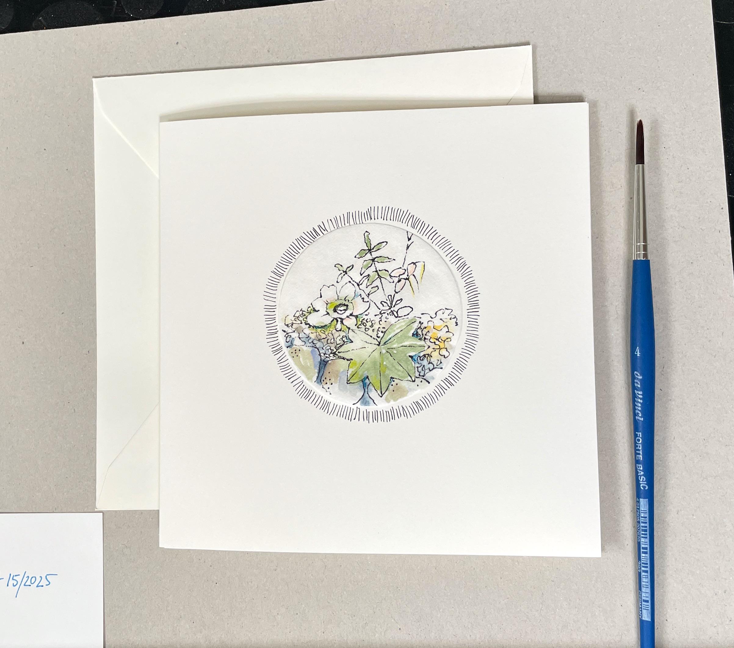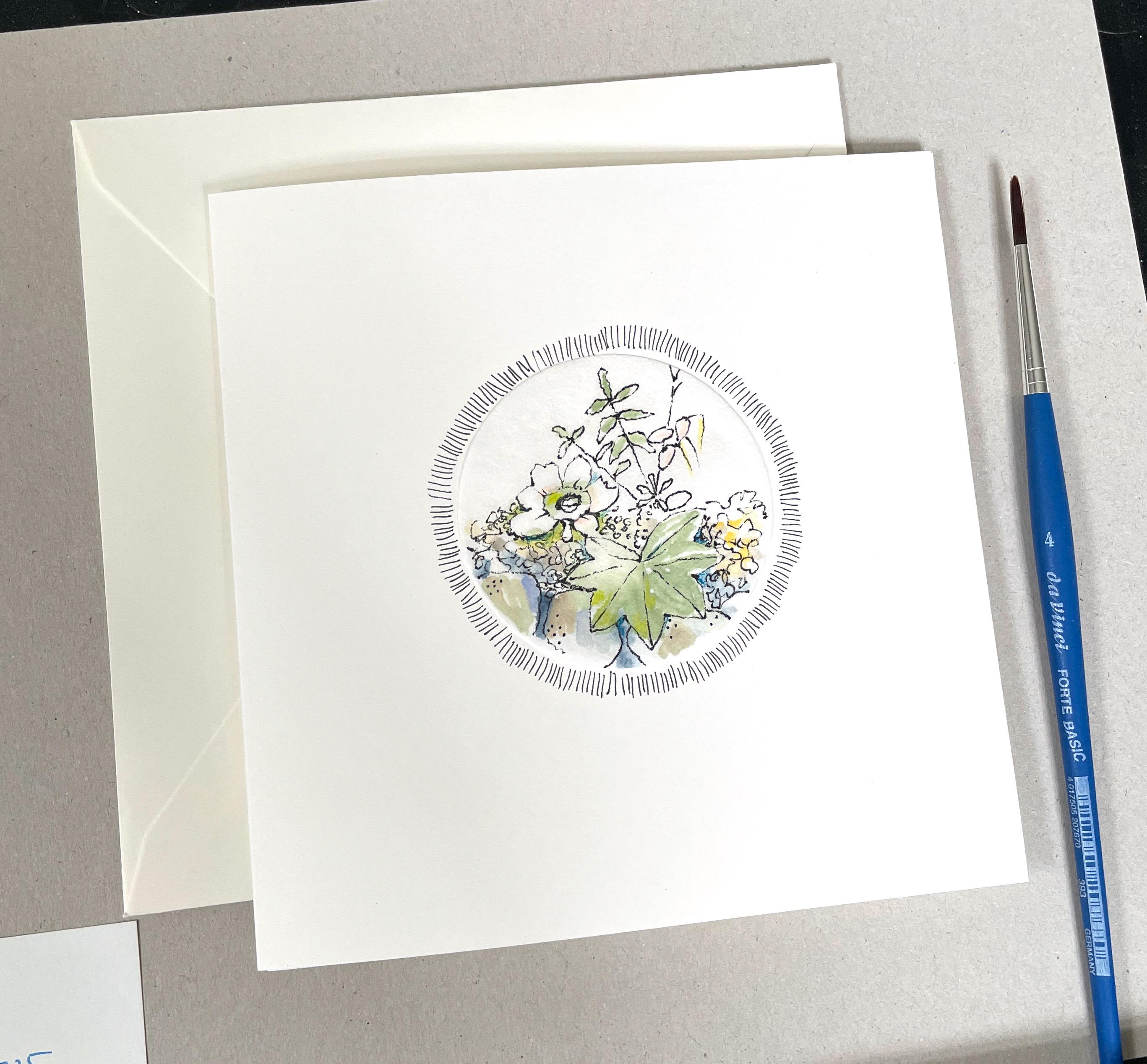 This handmade greeting card is a delicate little artwork: Drawn with a fine-liner and watercolors, it shows a subtle plant arrangement resting on stones. I created the illustration on a thin, round tissue-like paper and affixed it to a high-quality, eggshell-colored folding card (15 x 15 cm). The fine ink lines frame the motif gently.