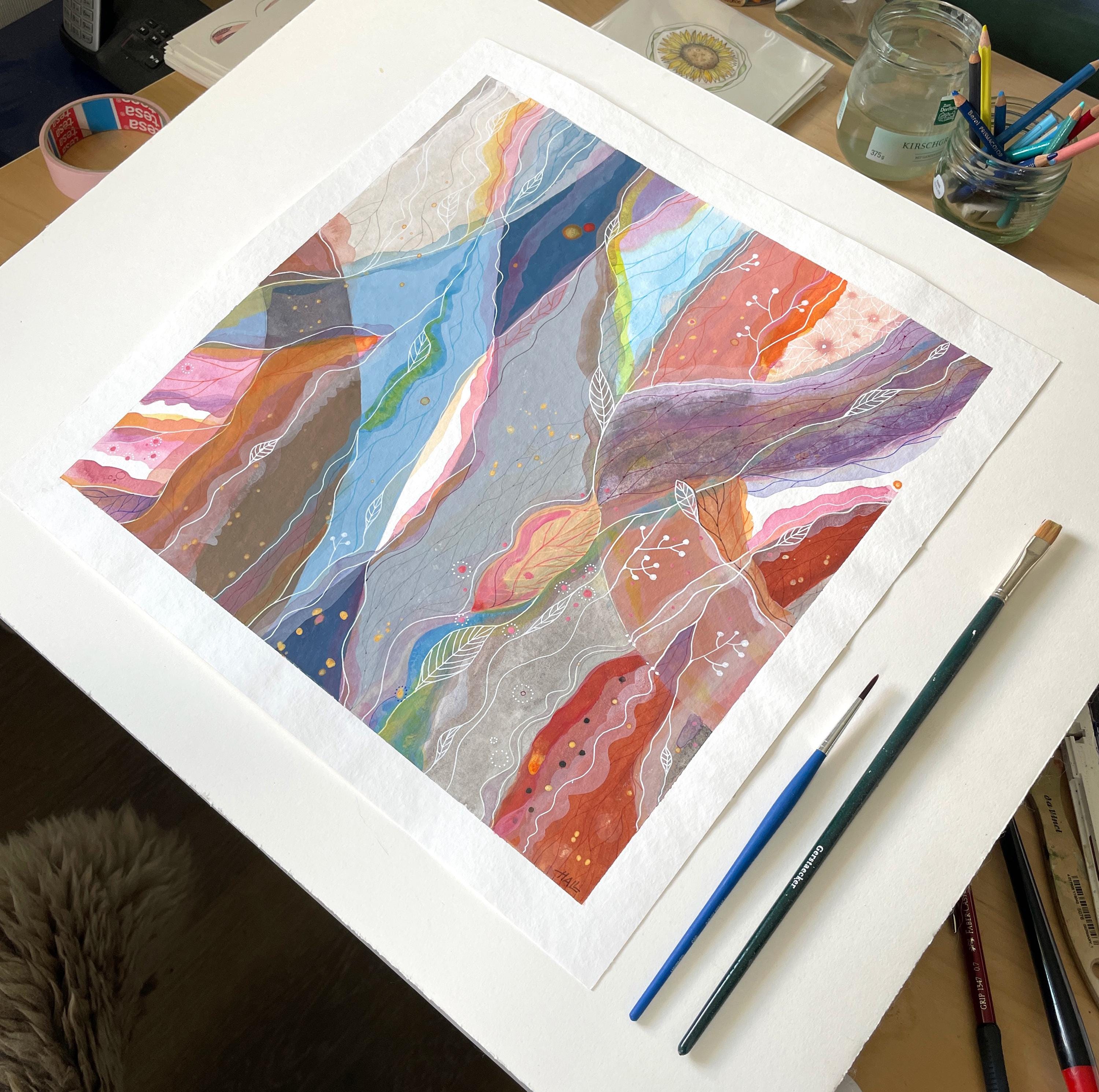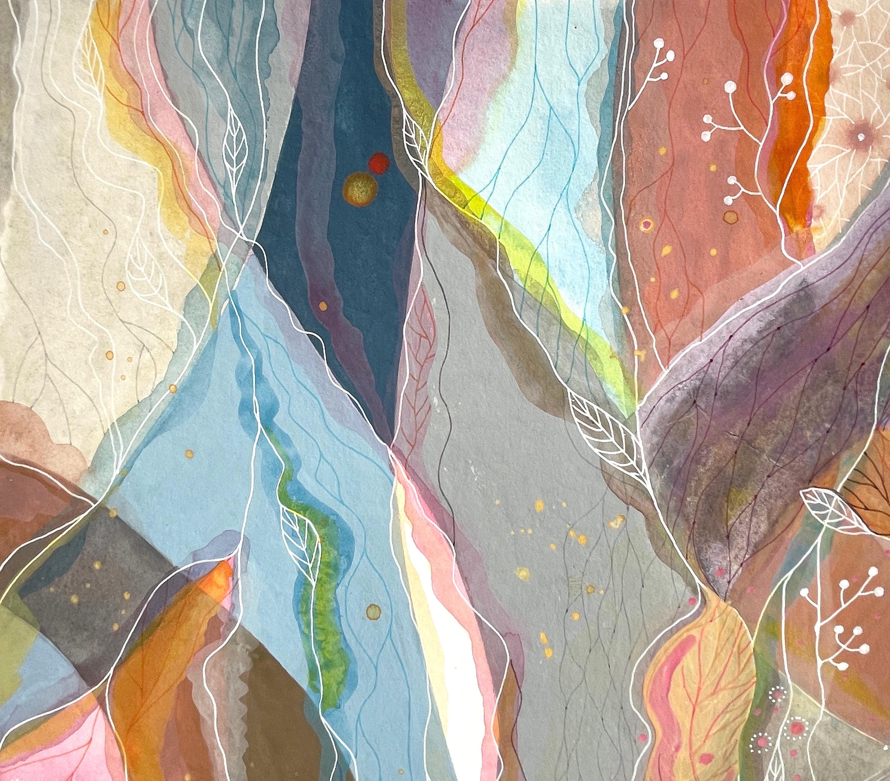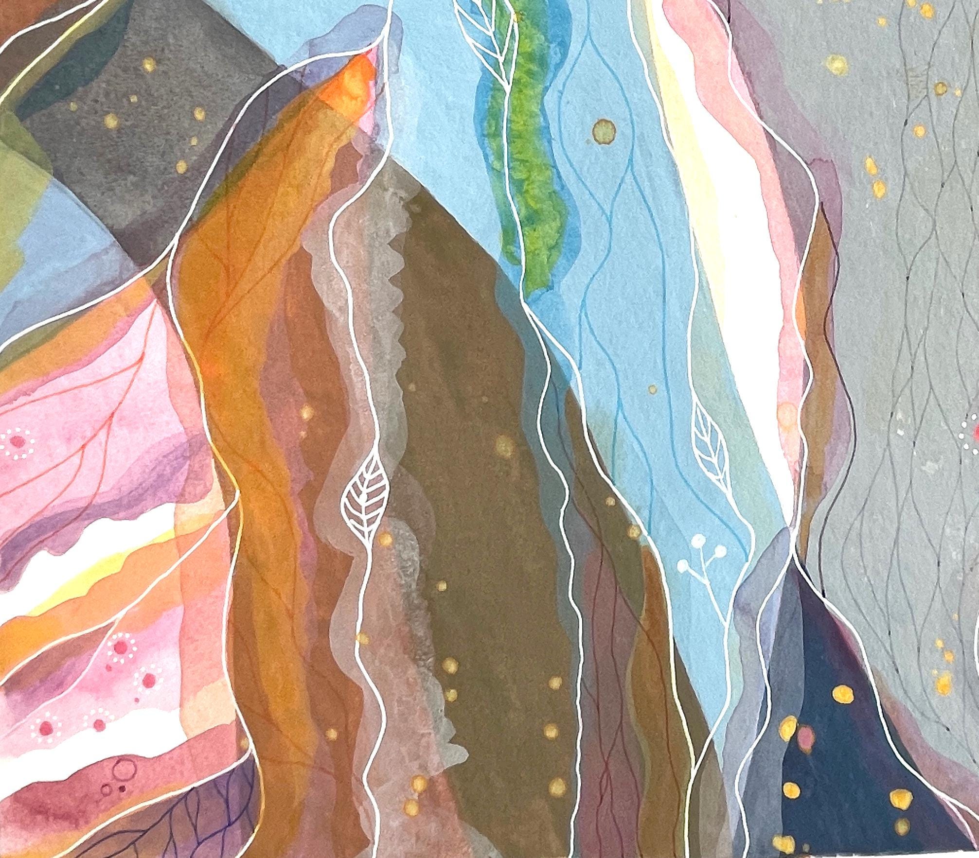 In such states, forms begin to flow naturally onto the paper. Color streams intertwine like inner waterways, forming organic landscapes which I then trace with delicate energy lines and graphic elements. It feels as if I am flying above them – feeling what I am painting.