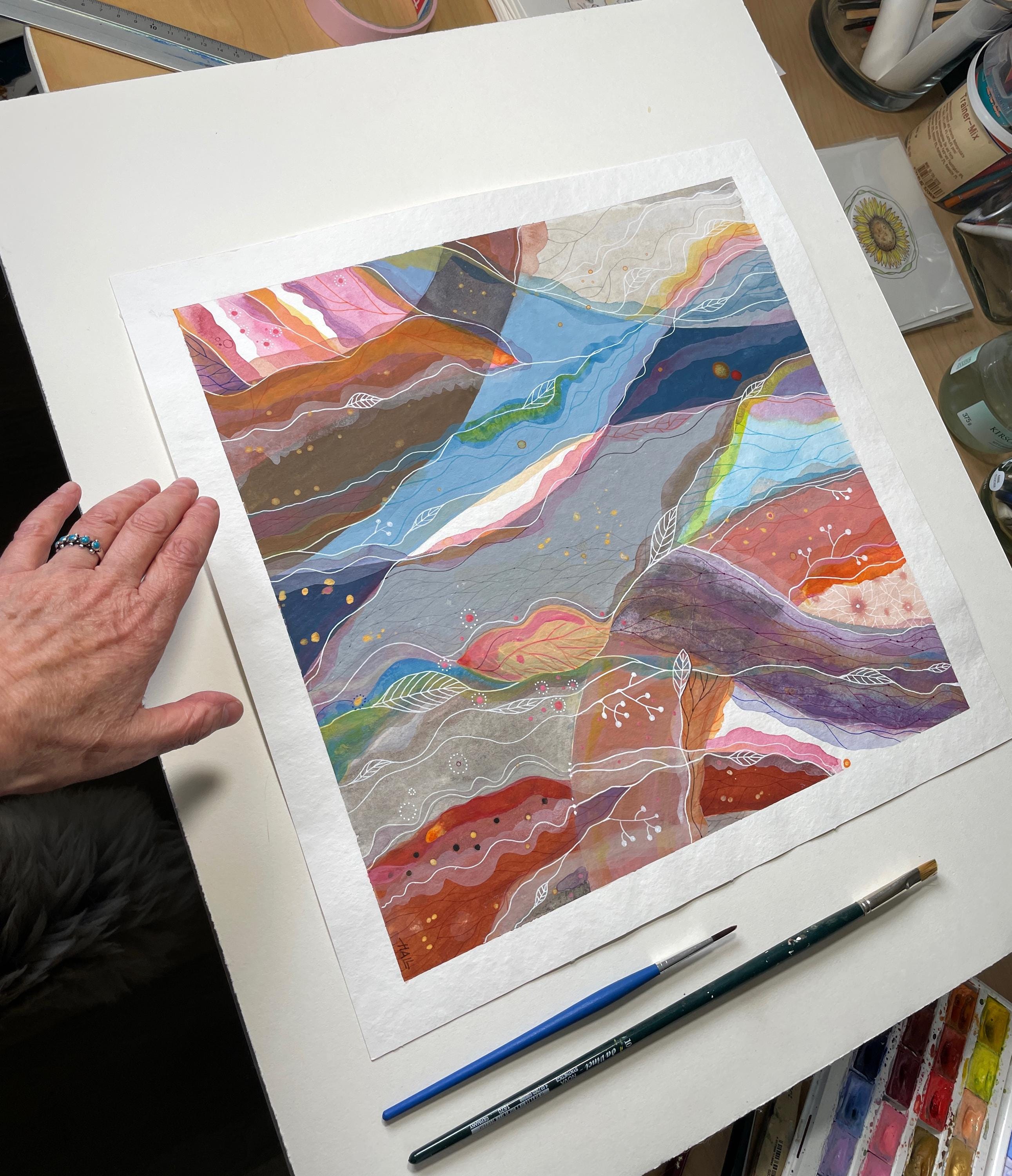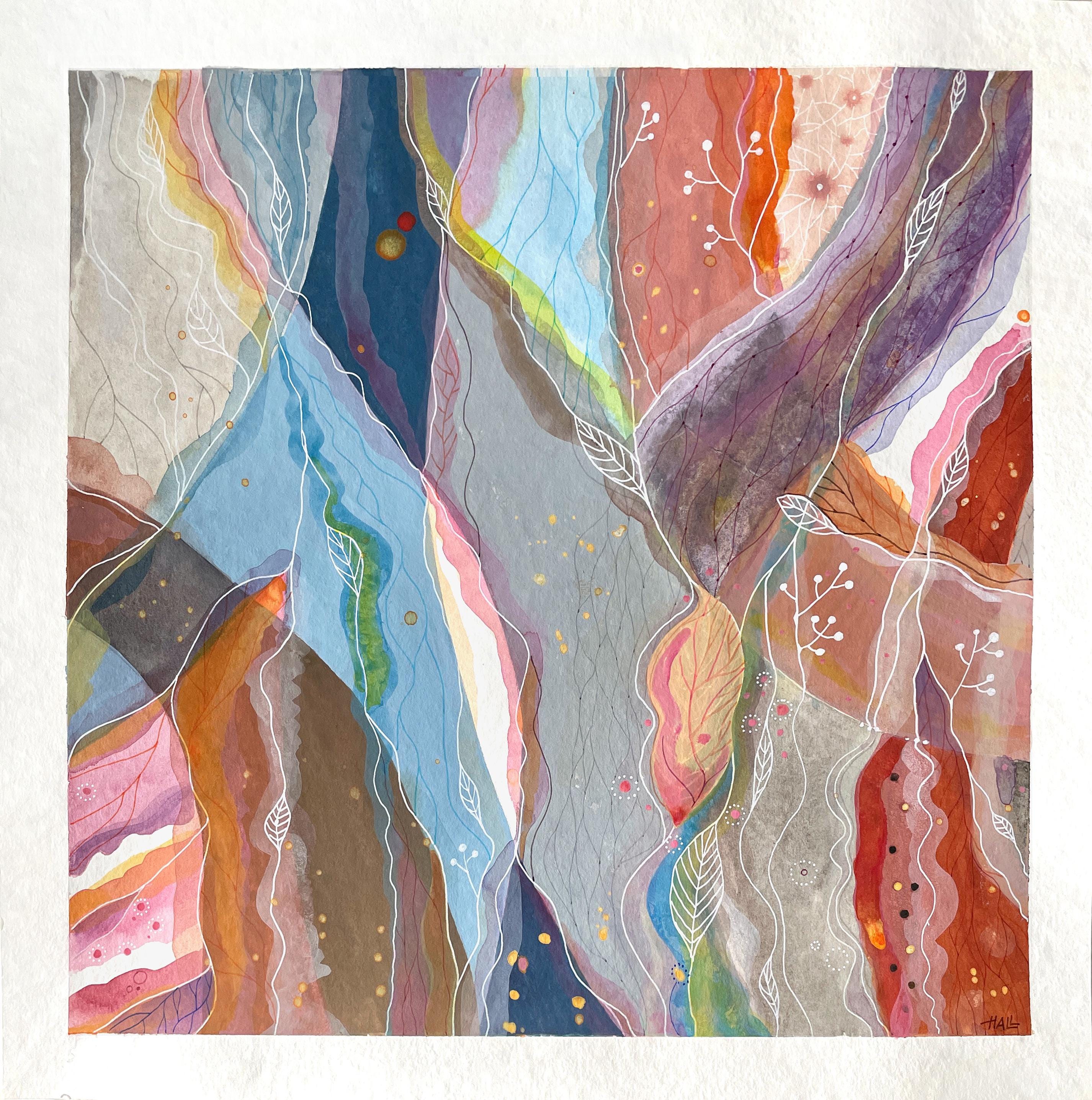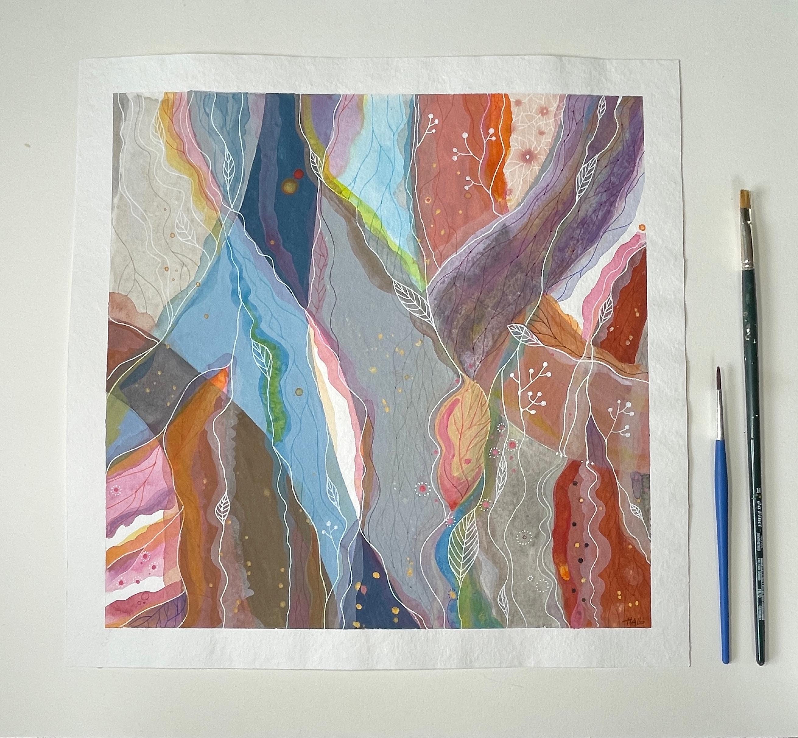 In such states, forms begin to flow naturally onto the paper. Color streams intertwine like inner waterways, forming organic landscapes which I then trace with delicate energy lines and graphic elements. It feels as if I am flying above them – feeling what I am painting.