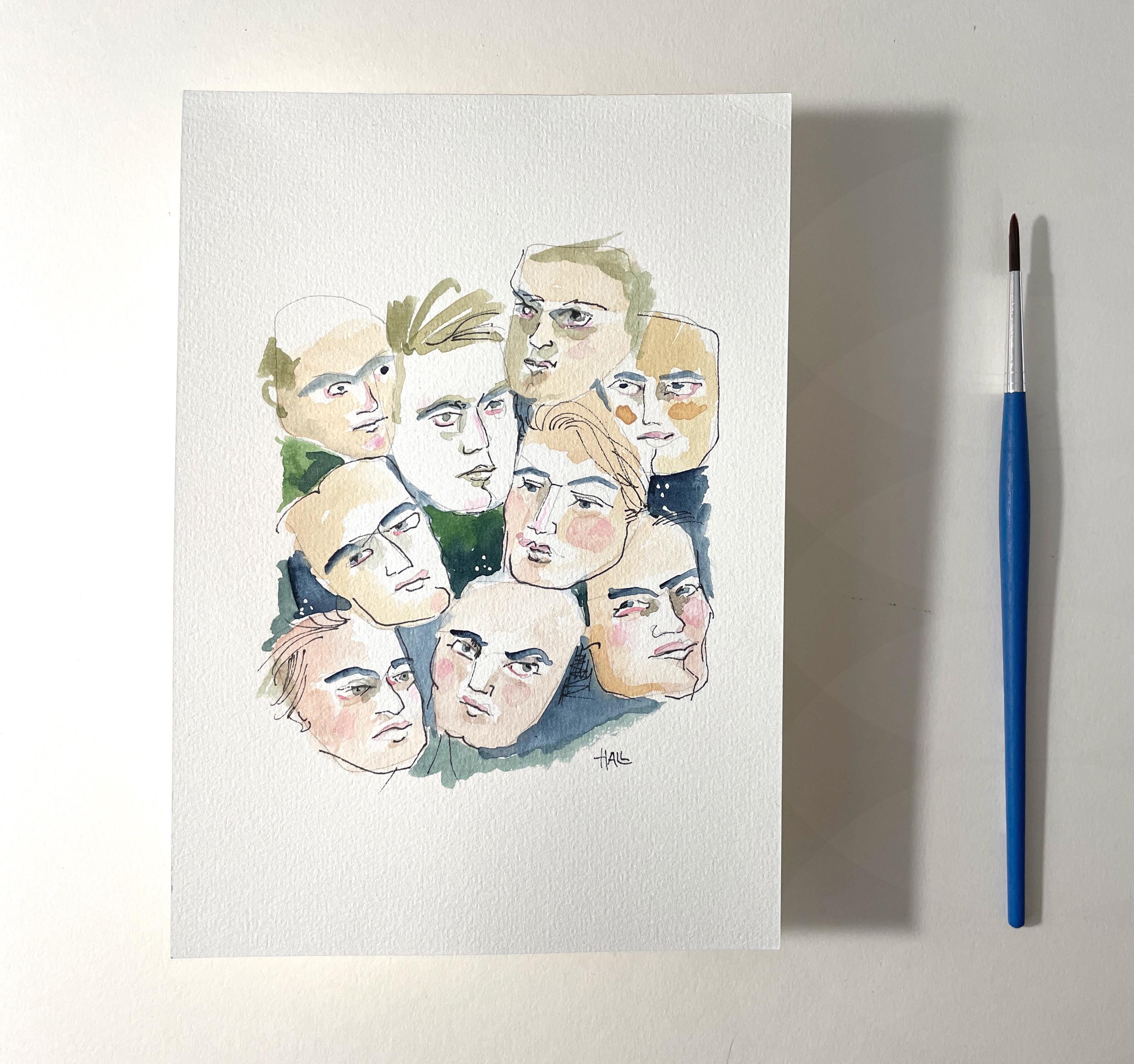 Unique watercolor drawing on 300g watercolor paper in A5 size. The artwork features nine stylish portraits of men's faces, sketched with fineliner and lovingly colored with watercolor paints. Inspired by observing human facial expressions, this piece reflects my passion for people and their emotions. Perfect for art lovers and as a special decorative item.