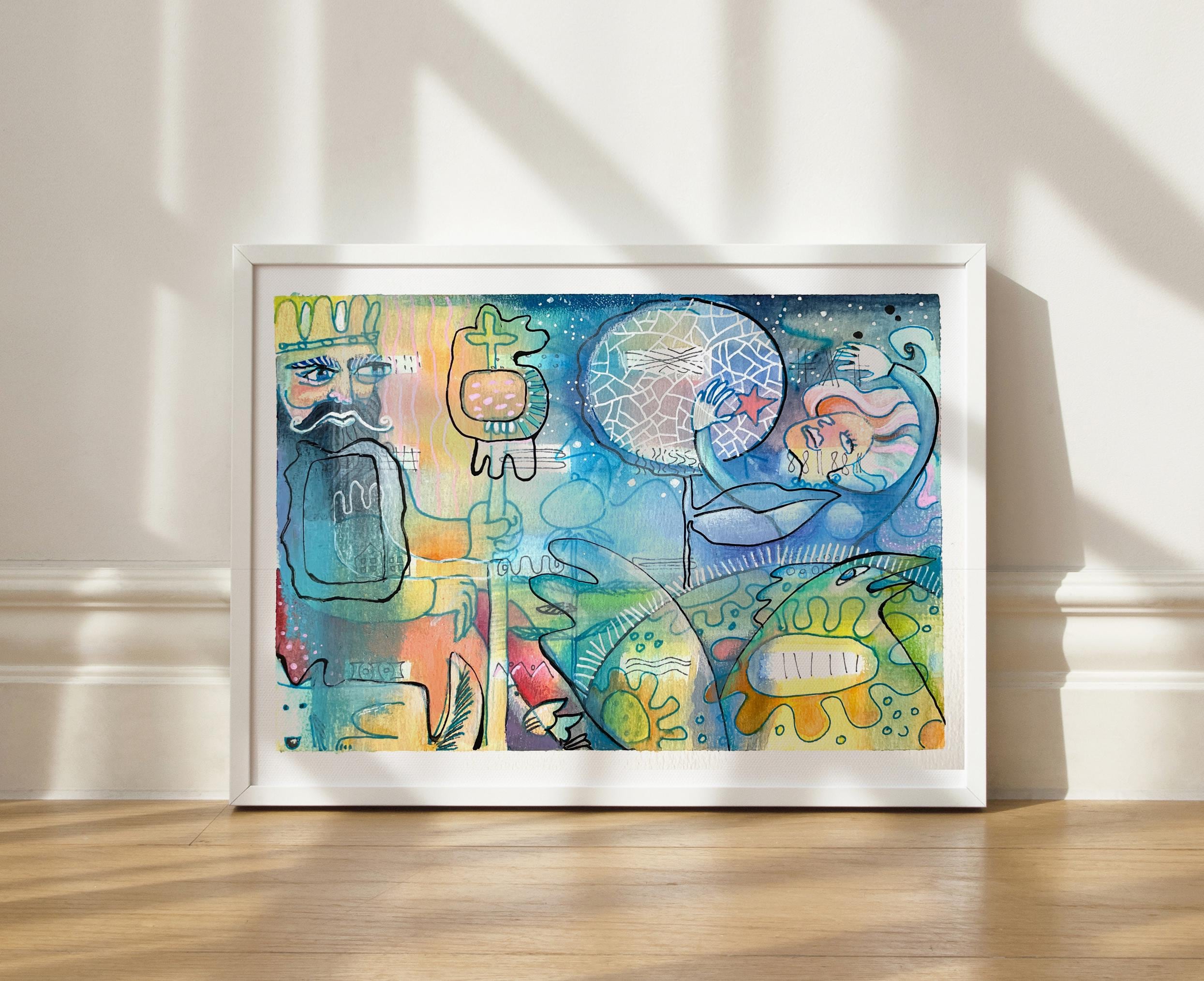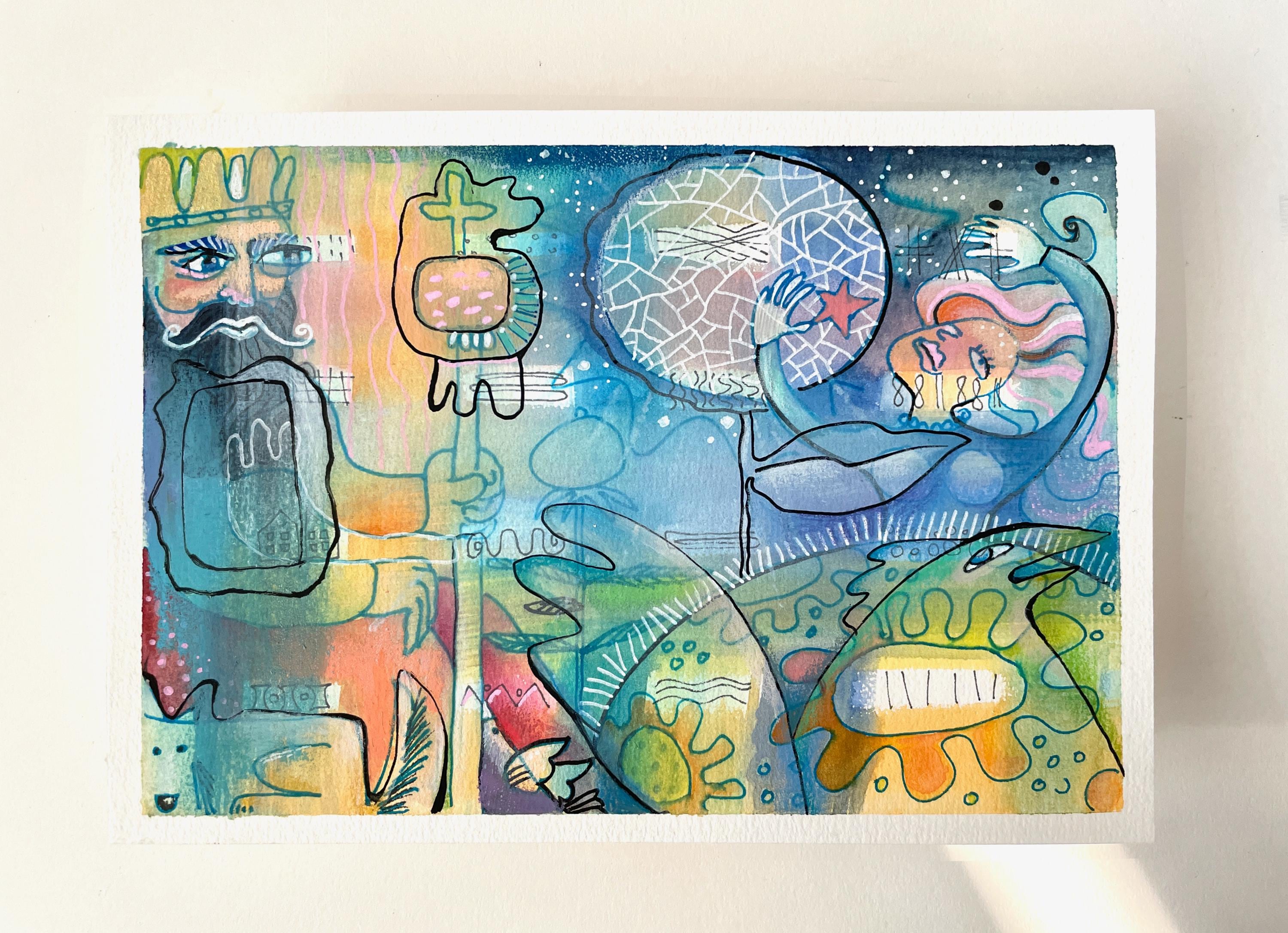 This artwork was created spontaneously, layer by layer, in a cool, nocturnal color palette. On the left, a king stands watch, holding his scepter – a paternal figure, sitting and watching. On the right a woman surrenders to the moon – mysteriously caught in the tides of emotion. Animals, symbols, and patterns weave together into a magical dreamscape.