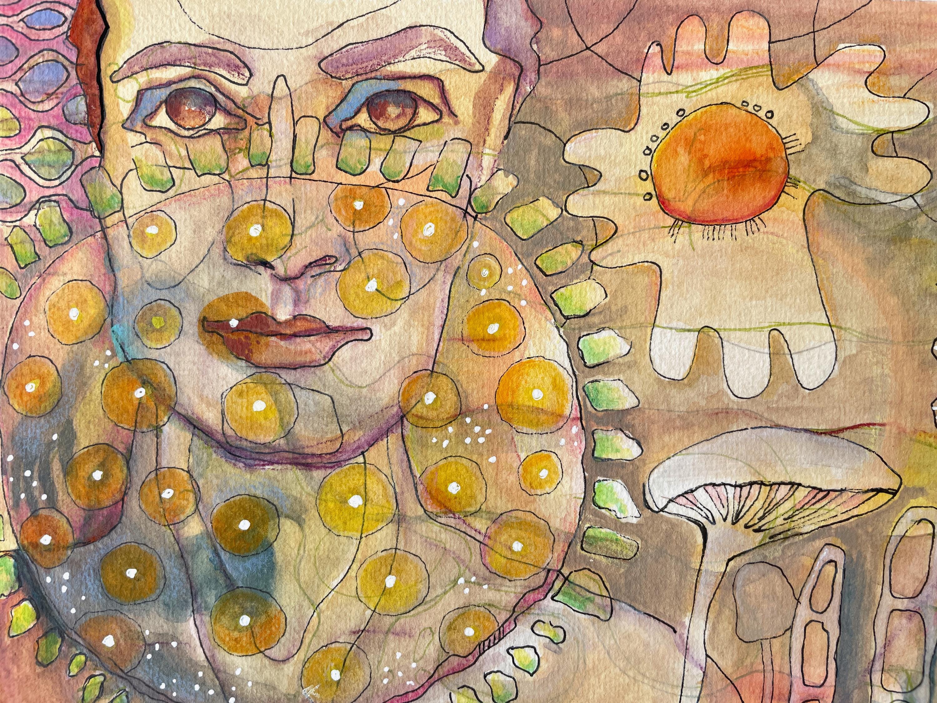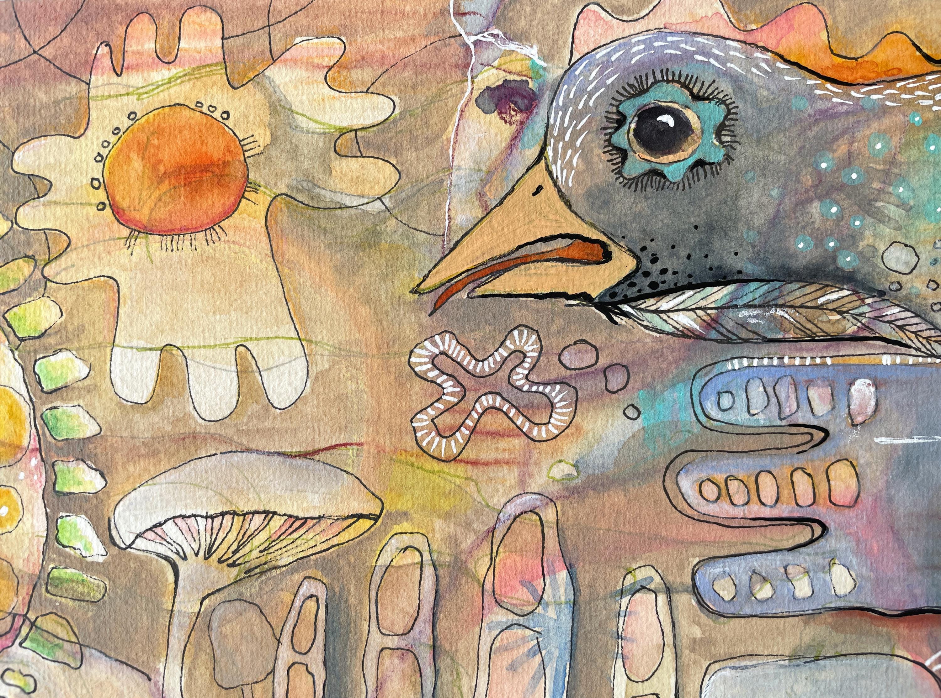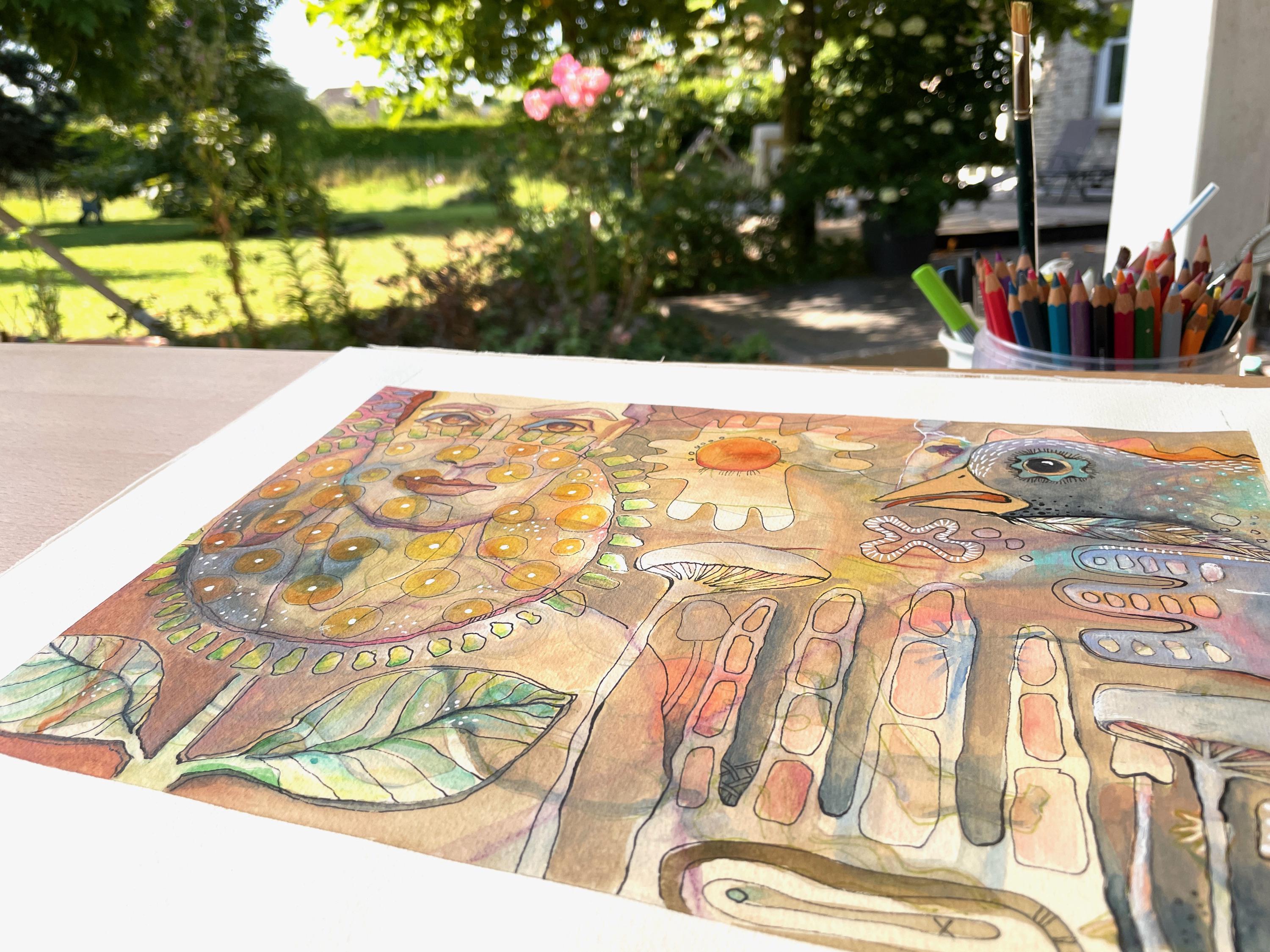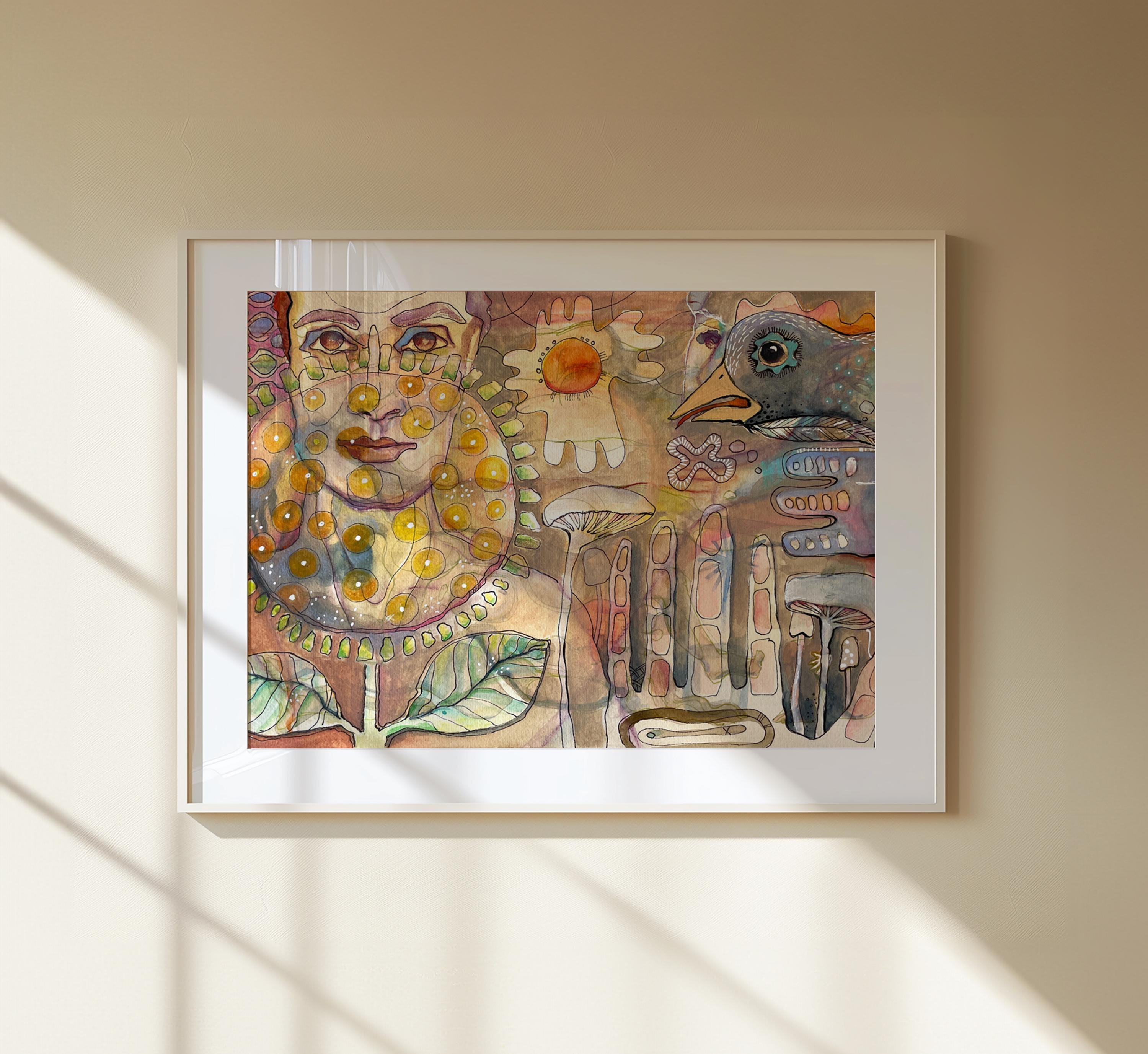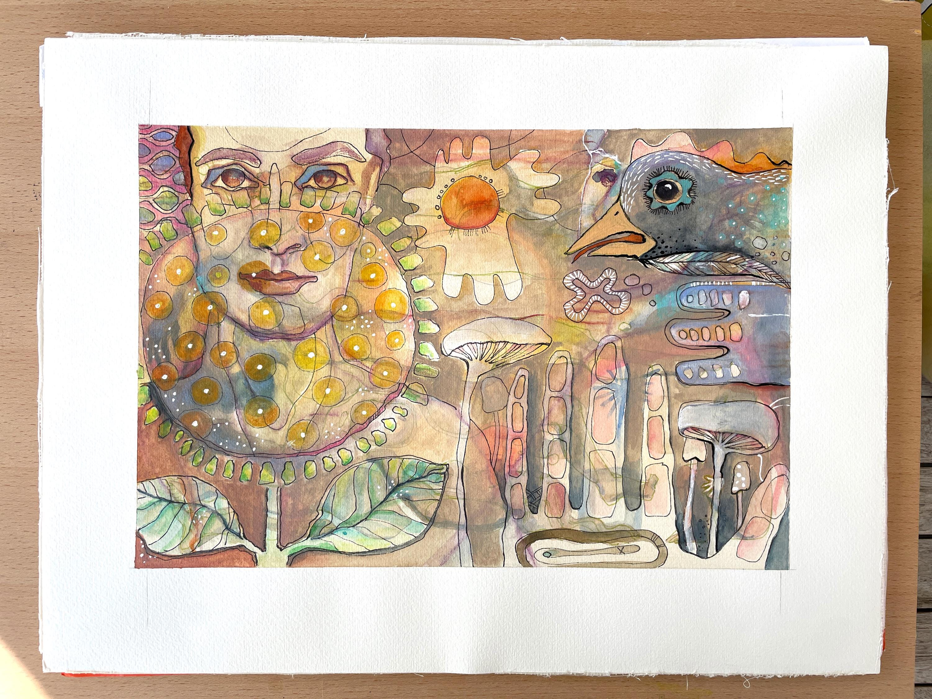 Created spontaneously on a warm summer day in the garden, this piece weaves a woman and a bird together with plants, seeds, leaves, and mushrooms in a symbolic dreamscape. The imagery is built in layers, flowing into one another, blending fantasy with elements of nature.