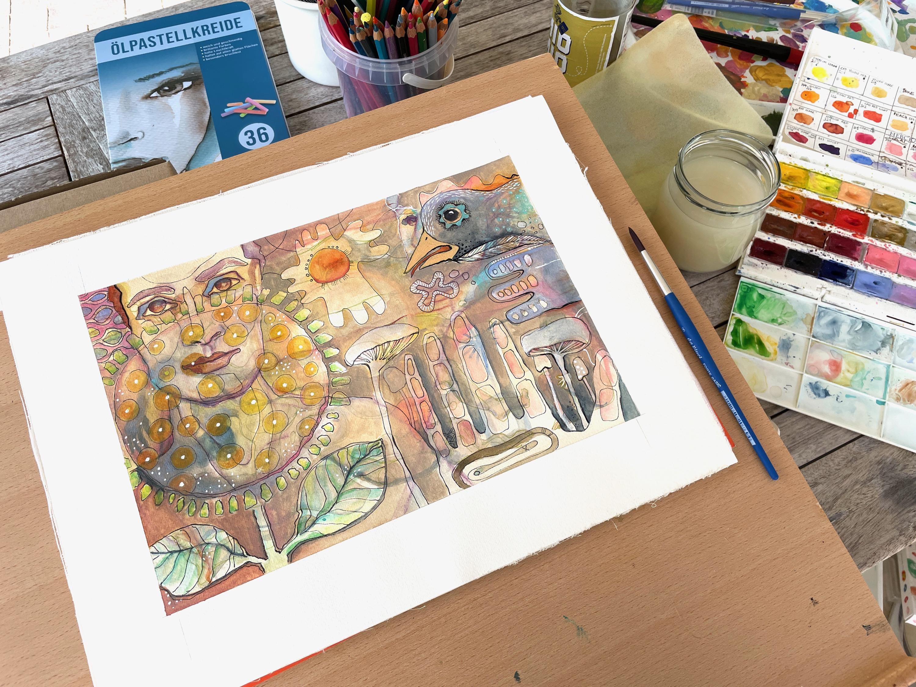 This piece is part of the 'Symbolic Dreamworlds' series – intuitively painted mixed media originals full of symbolism, fantasy, and delicate color worlds.