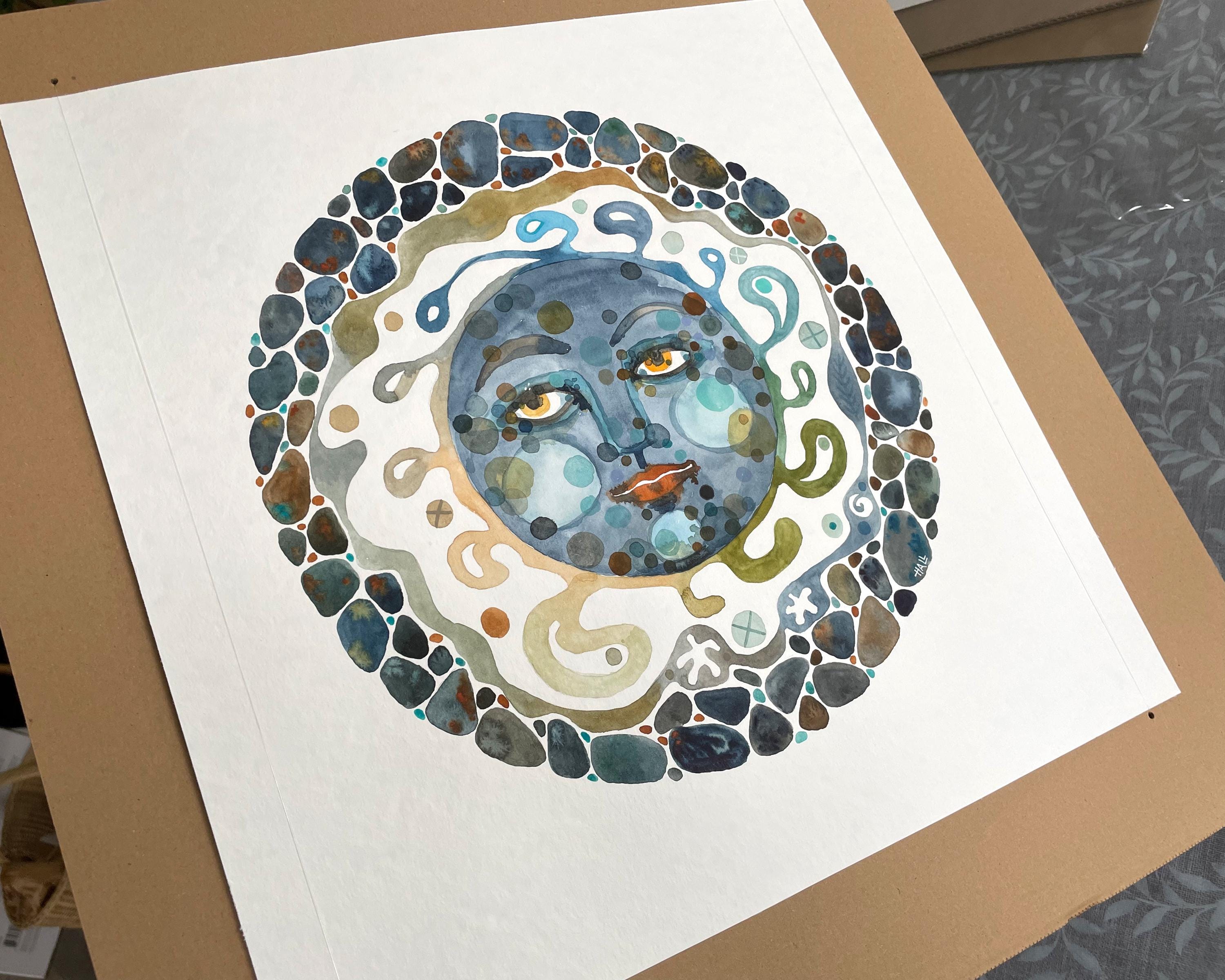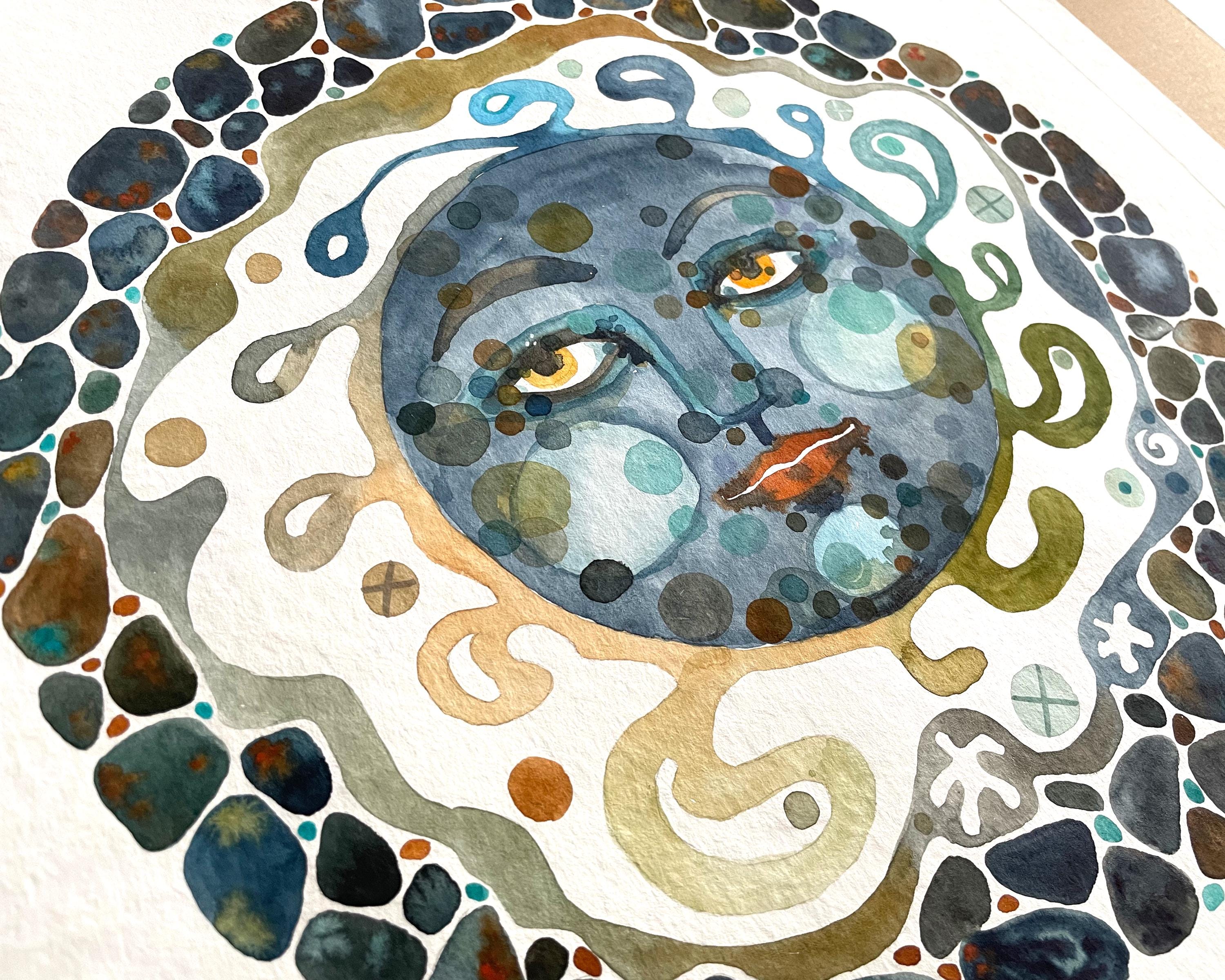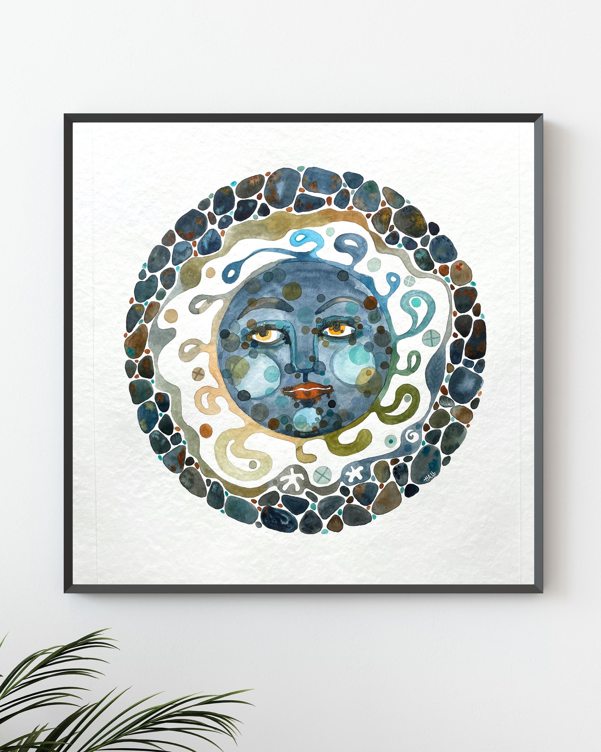 'Eclipse Season' – hand-painted original watercolor (40x40 cm on 300gsm watercolor paper) featuring a mysterious sun emerging from a circle of dark, mosaic-like stones. Her face gazes calmly with golden eyes – a union of sun and moon, earth and sky.