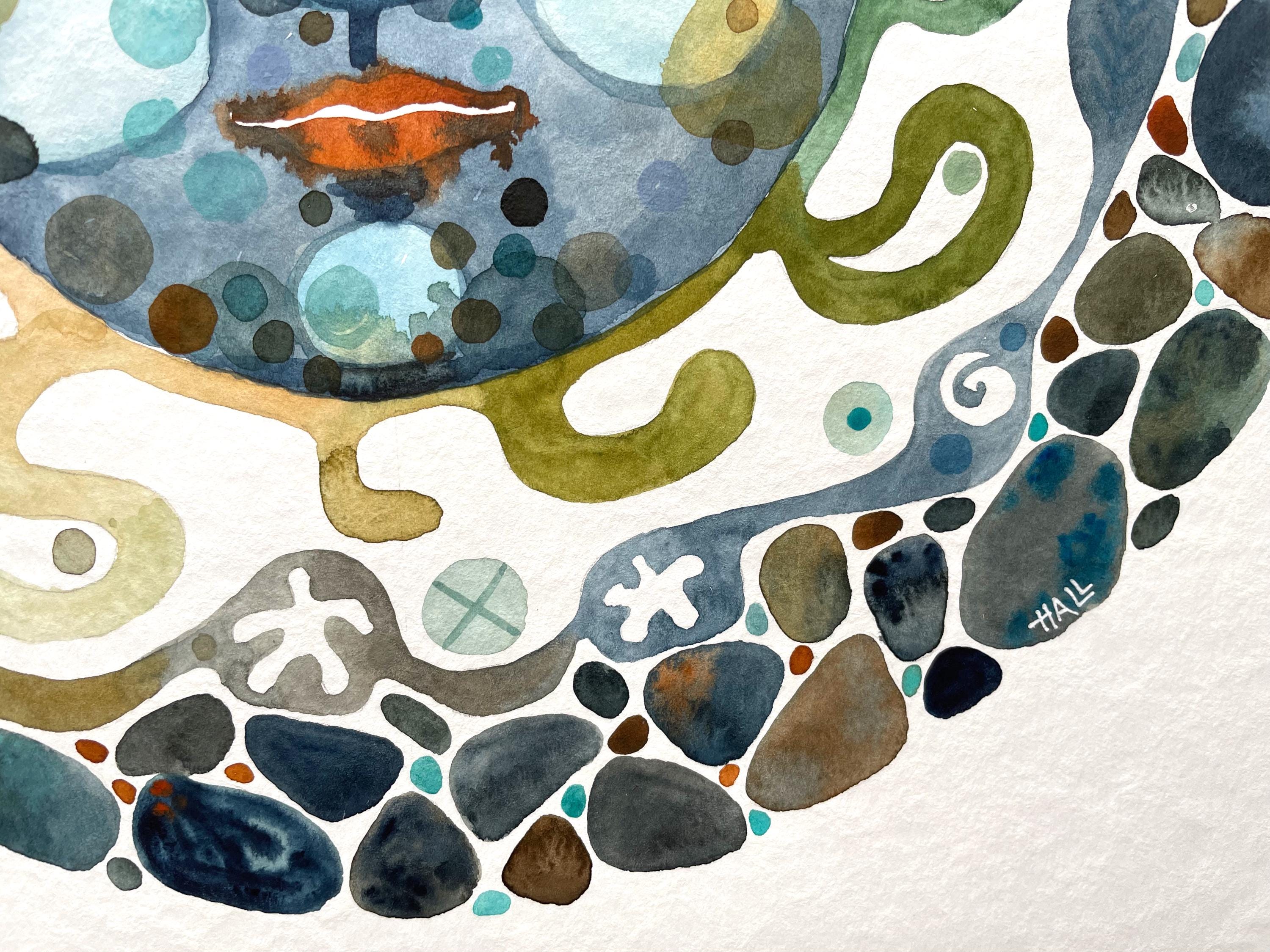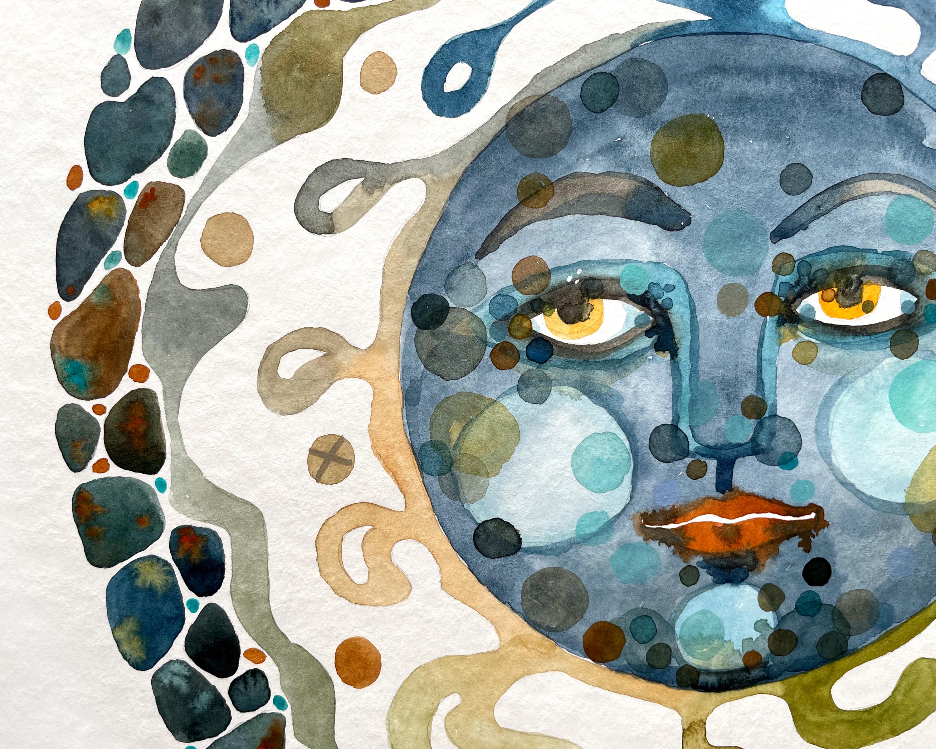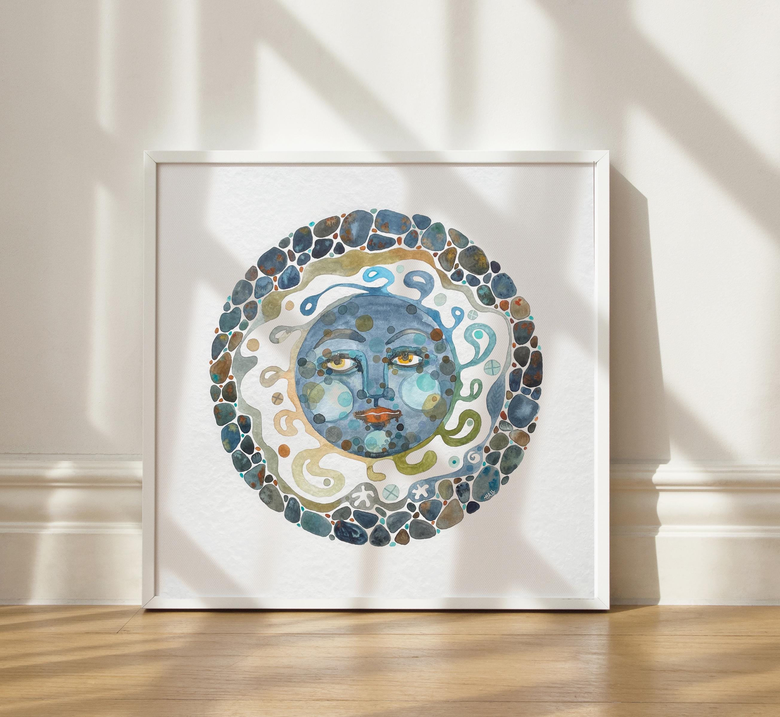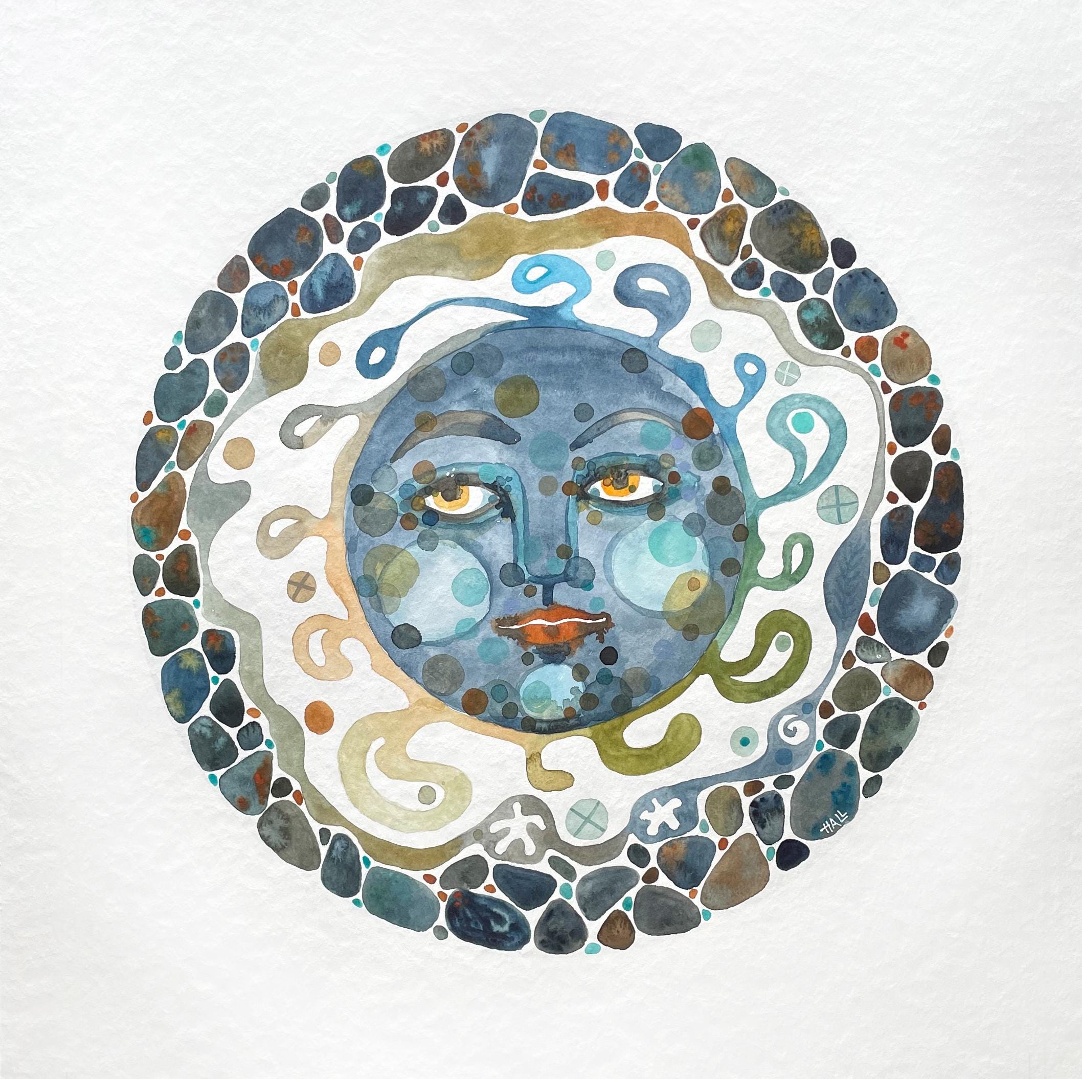 'Eclipse Season' – hand-painted original watercolor (40x40 cm on 300gsm watercolor paper) featuring a mysterious sun emerging from a circle of dark, mosaic-like stones. Her face gazes calmly with golden eyes – a union of sun and moon, earth and sky.