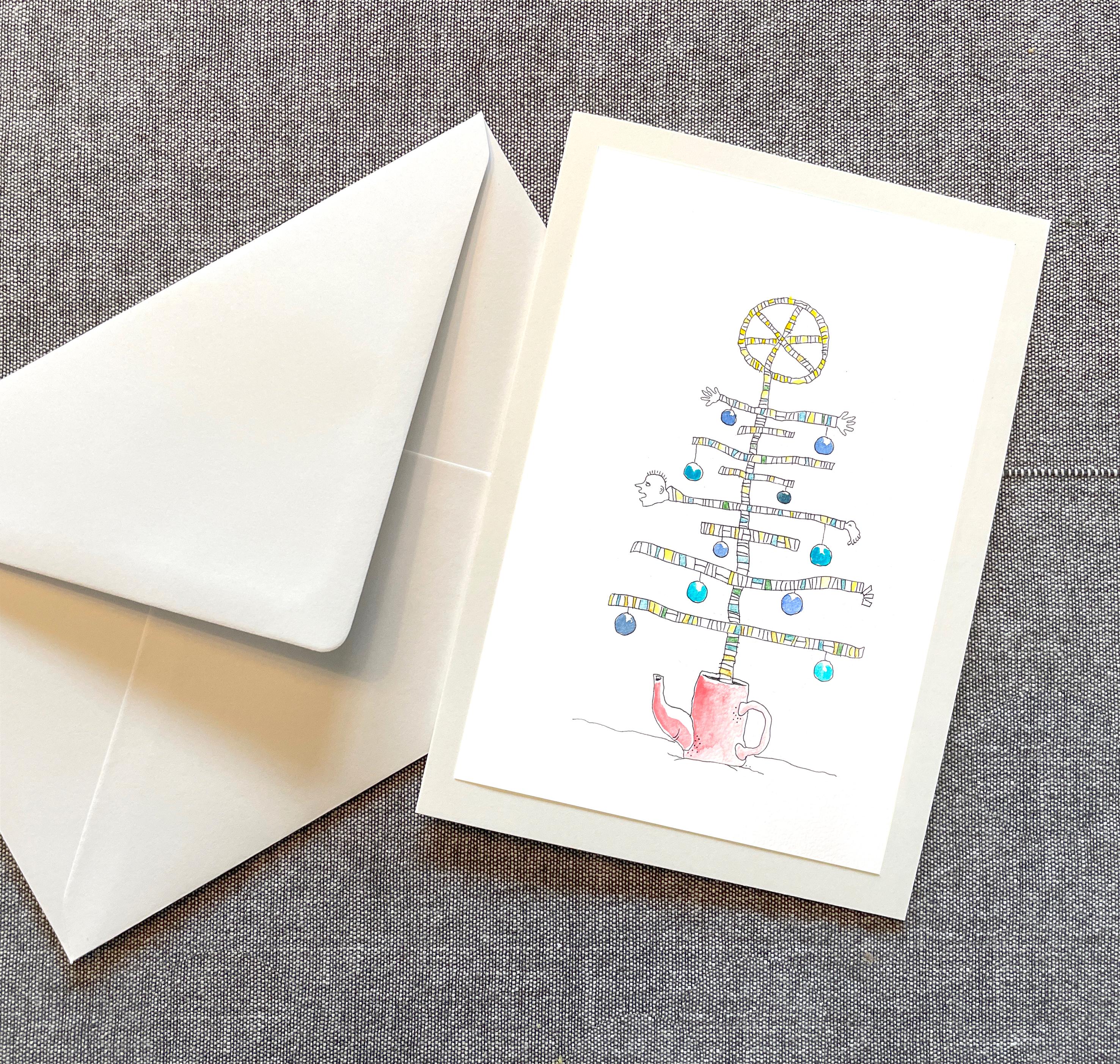 Weihnachtskarte mal anders! Die Welt ist verrückt – die Weihnachtskarte auch. Von Hand gezeichnet mit Fineliner und mit Aquarell coloriert. Für die elfenbeinfarbene Faltkarte habe ich einen matten Druck von der Originalzeichnung verwendet.
