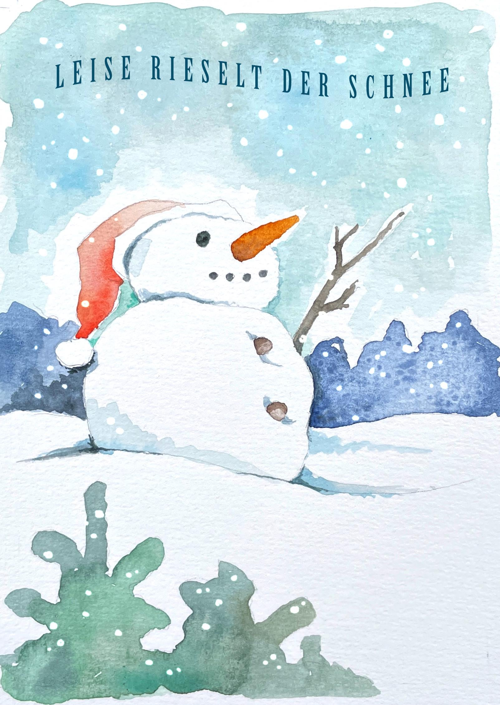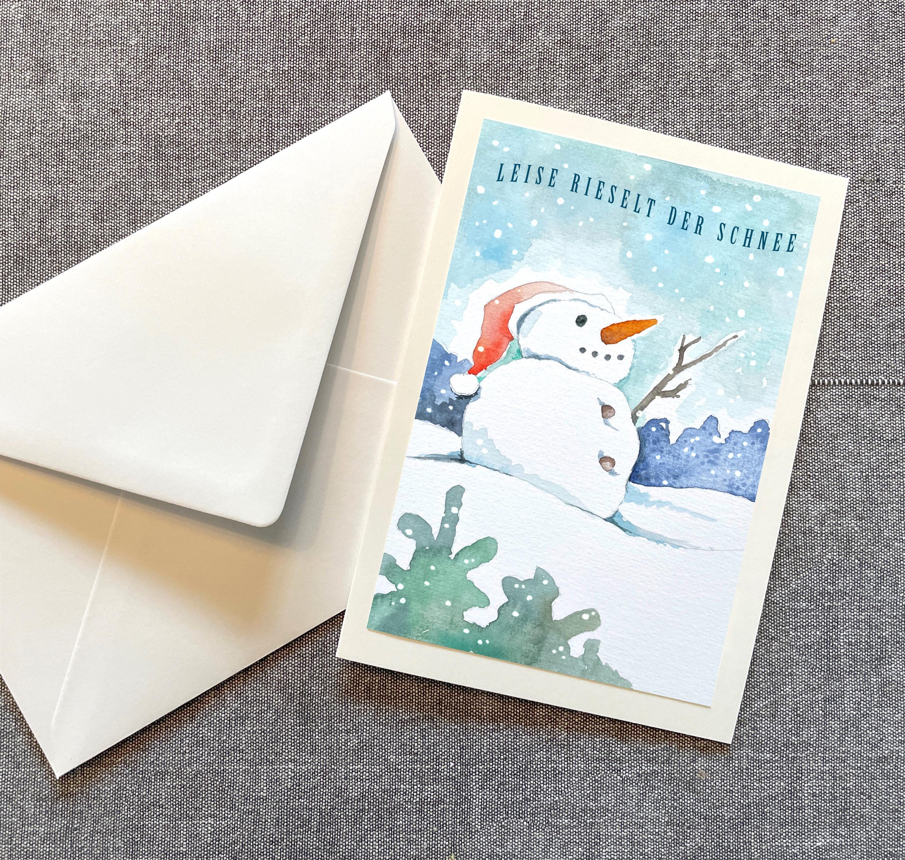 A cheerful Christmas card featuring a lovingly painted snowman in a winter landscape. This B6-sized greeting card comes with a matching envelope and an extra insert (in case of a typo...).