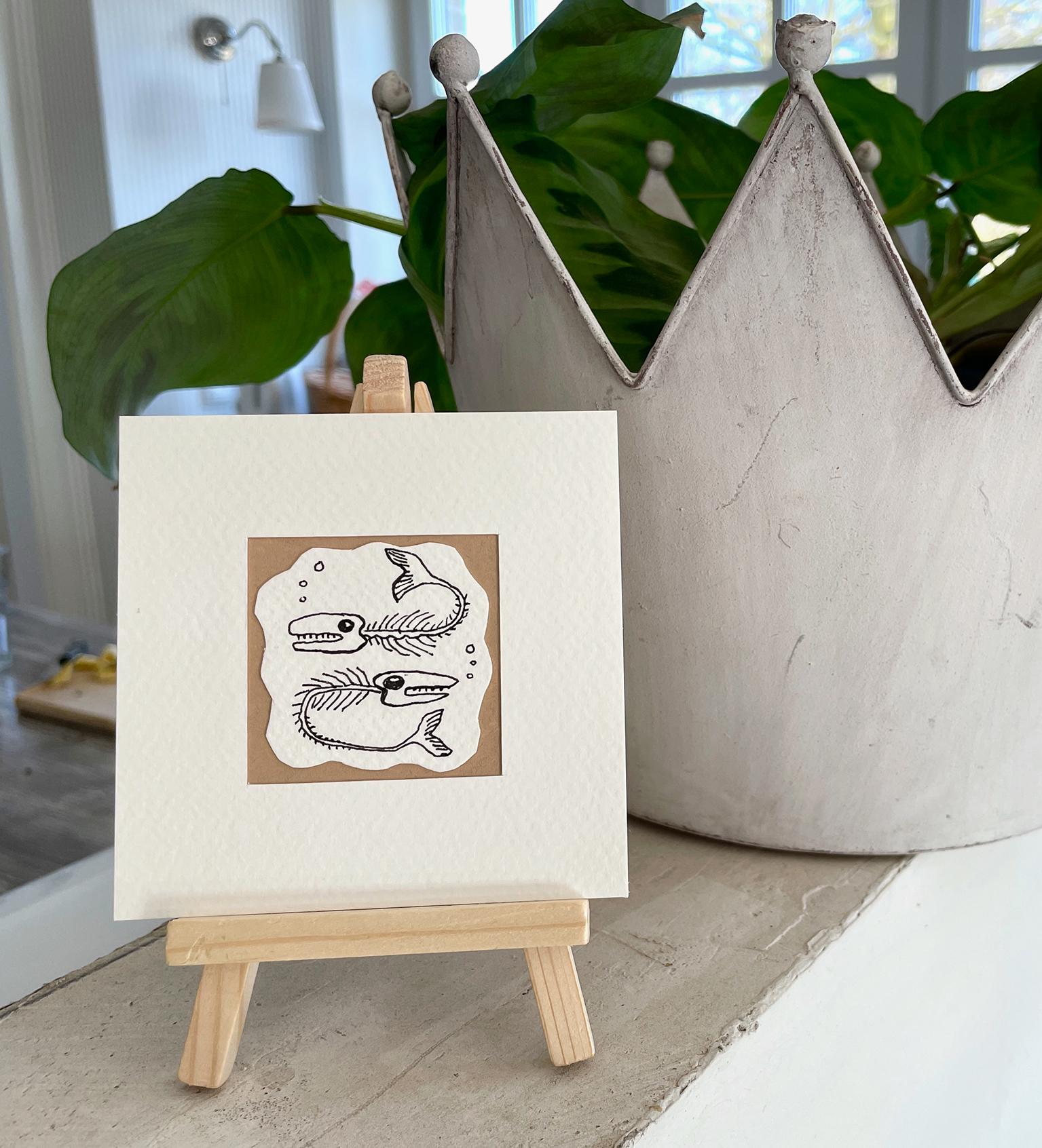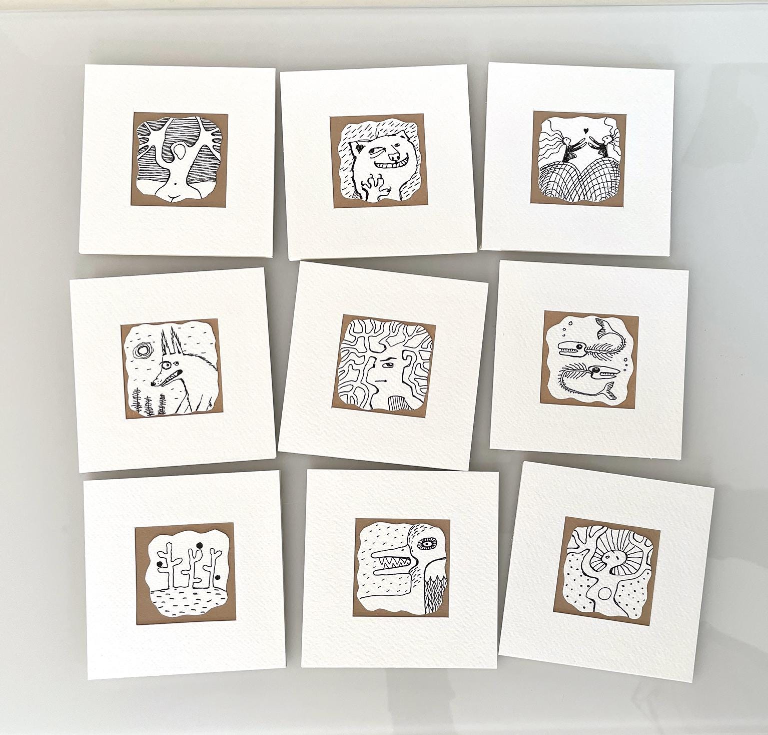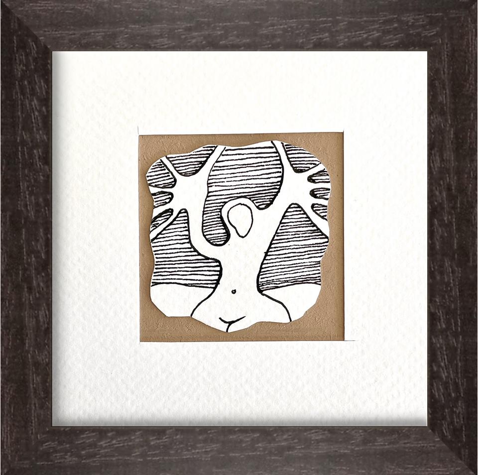Here you can choose your favorite from nine original drawings. These whimsical drawings are done on watercolor paper, cut out freehand, and mounted on cardboard. Each one is unique, framed with a handmade passe-partout, and signed on the back.