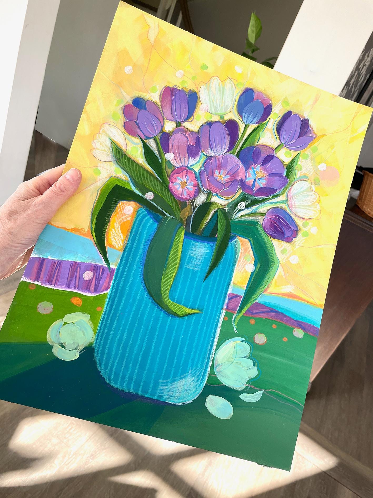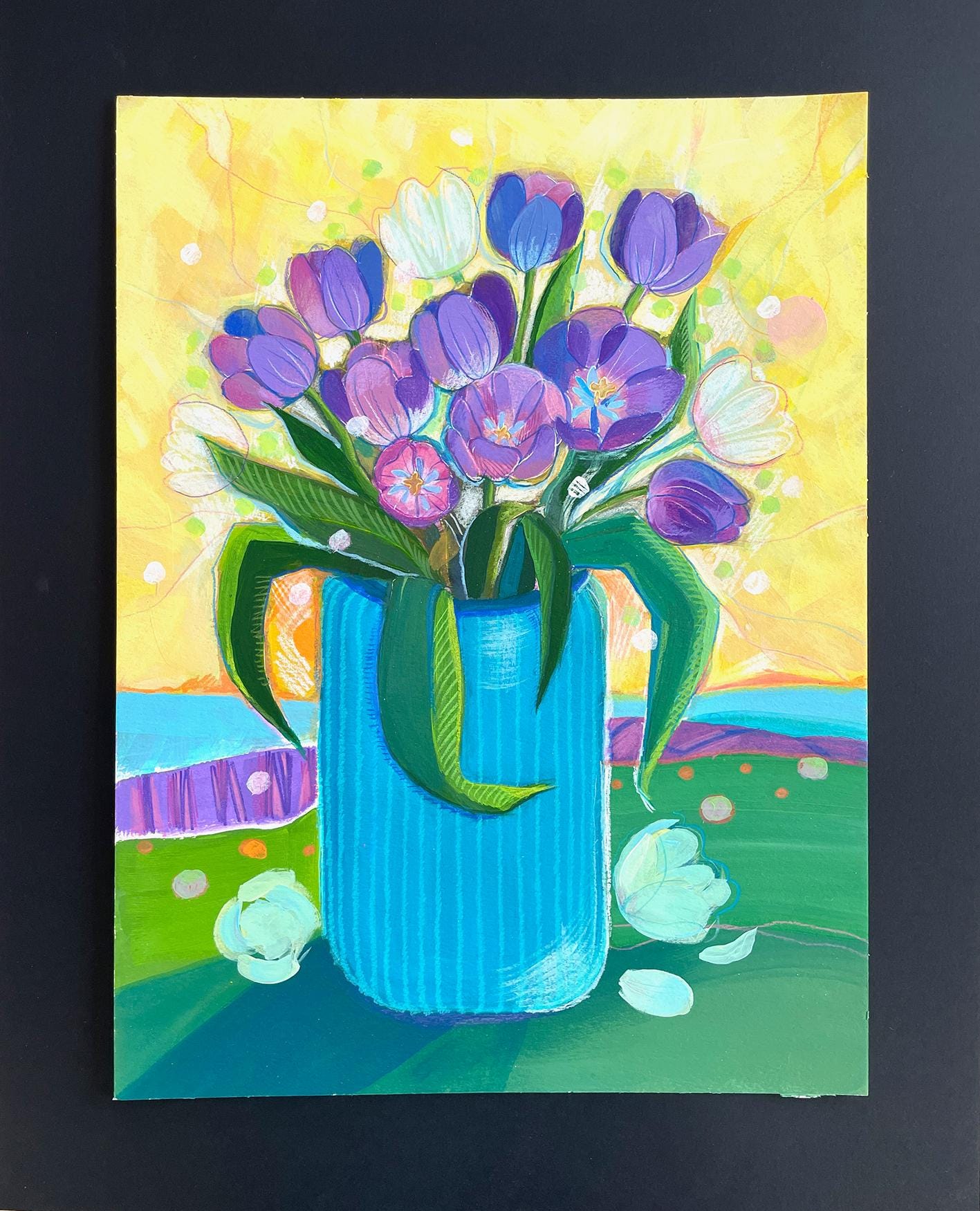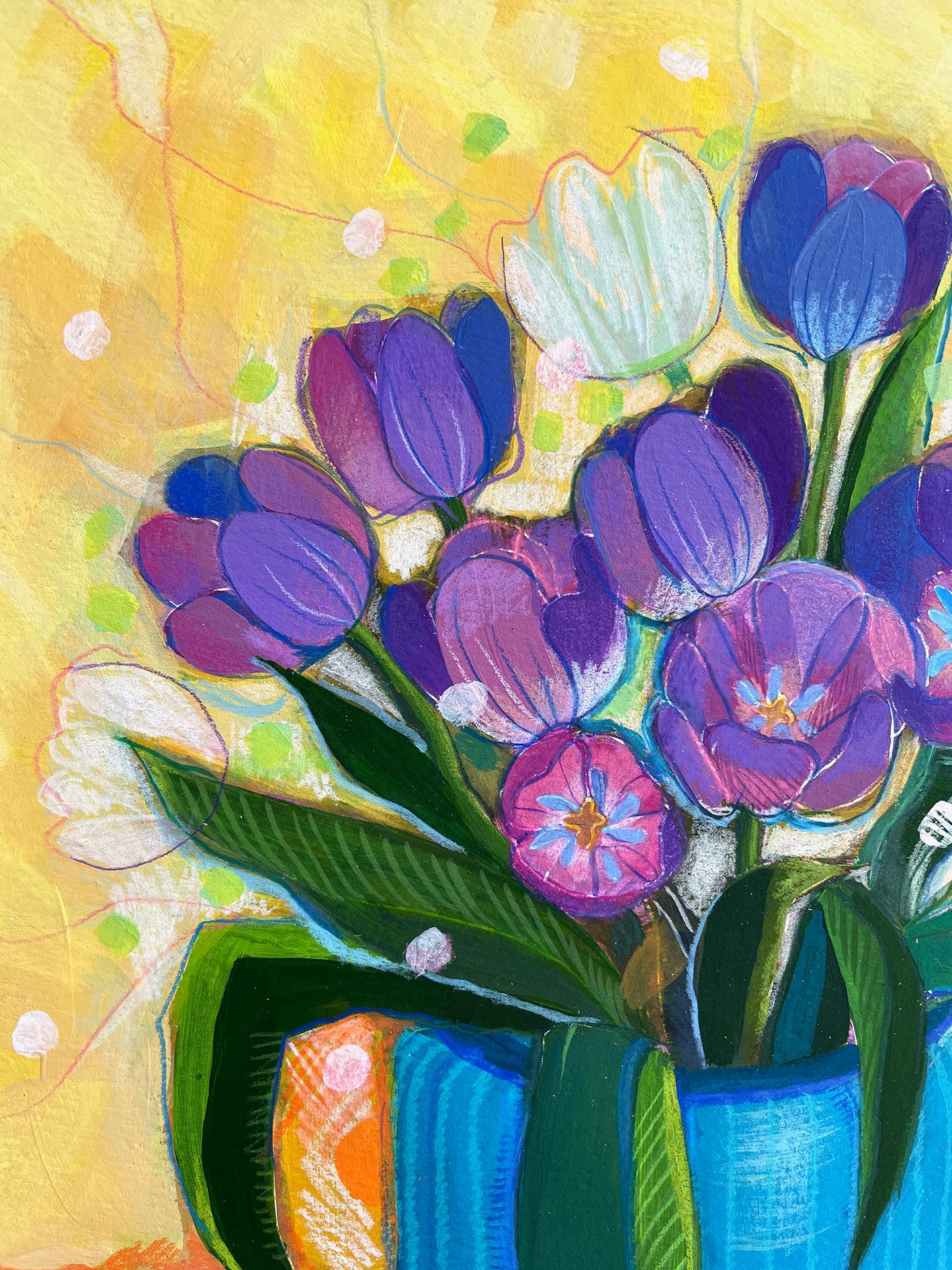 I used a mixture of acrylic paints, colored pencils, and chalk to bring out the purple tones of the tulips, the bright yellow of the background, and the light blue vase.