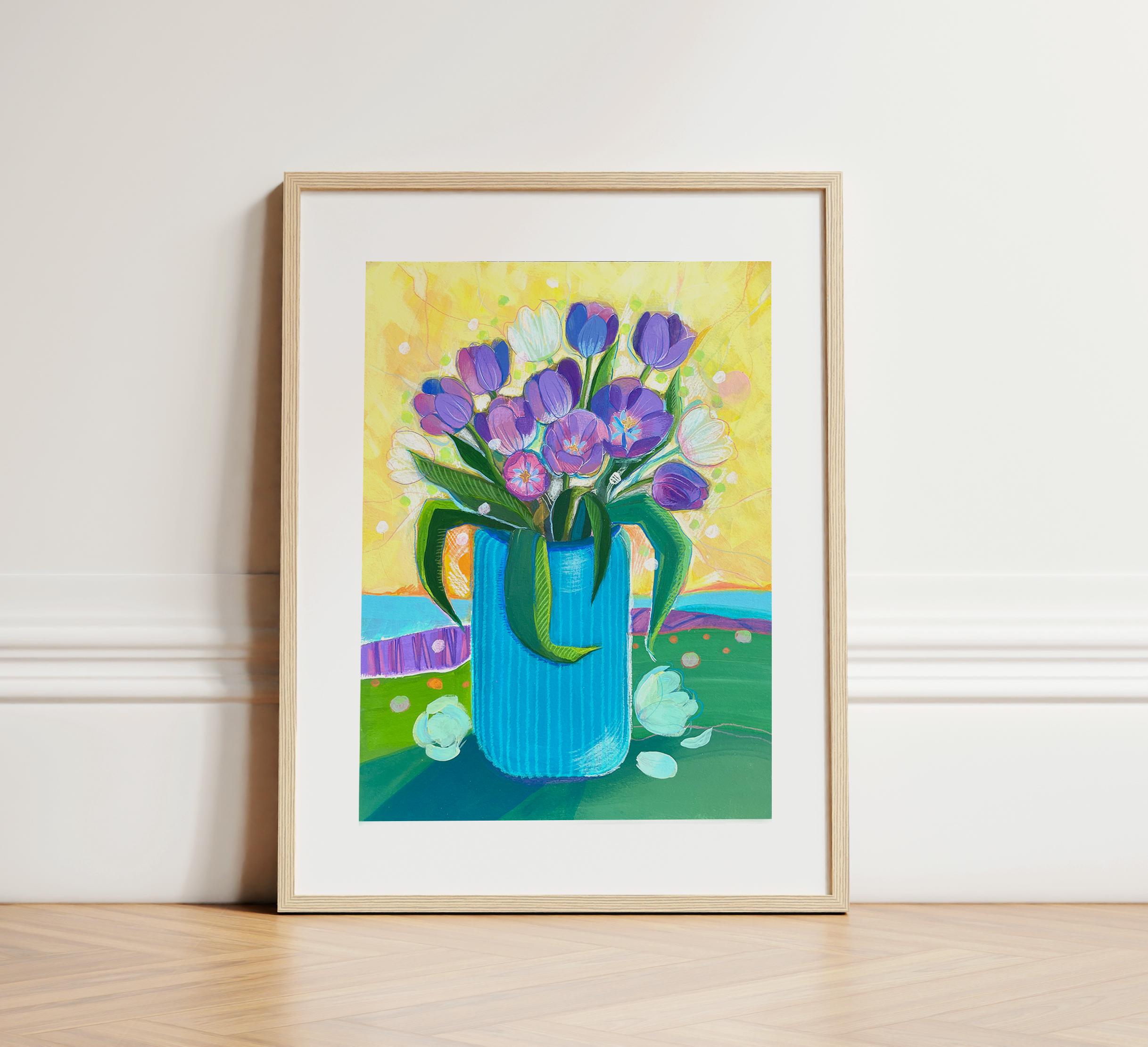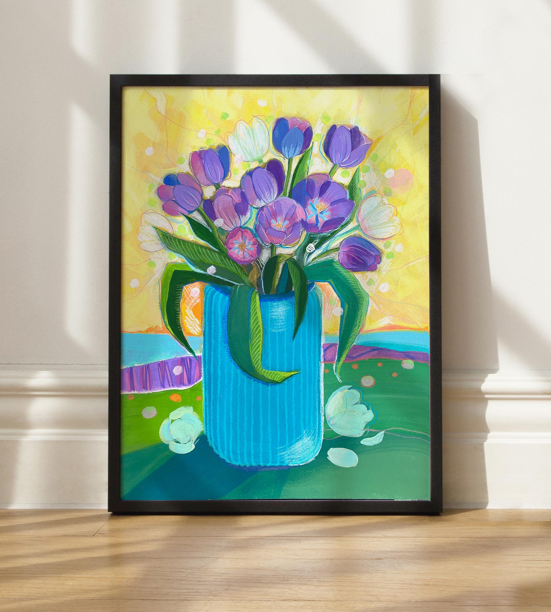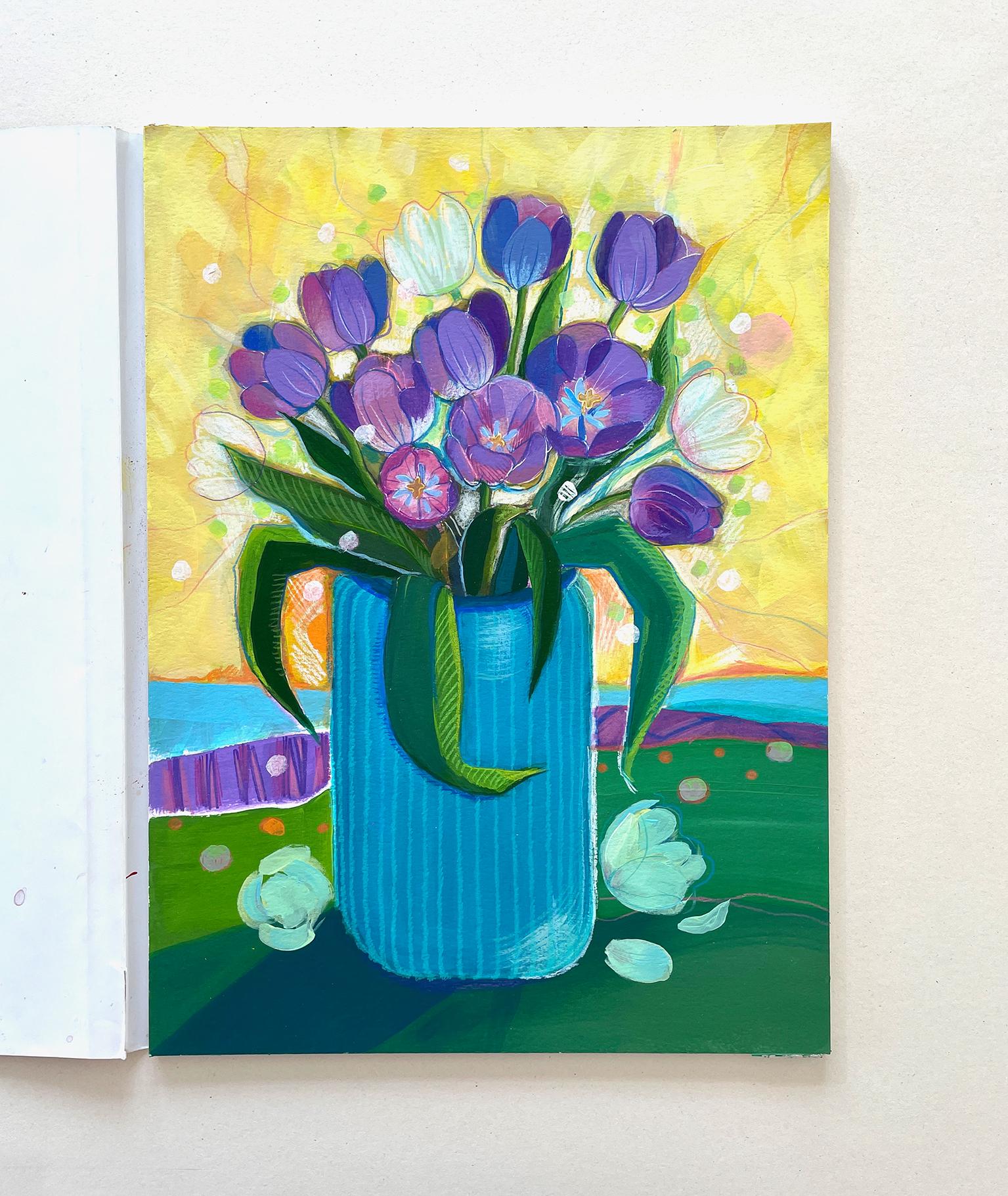 I used a mixture of acrylic paints, colored pencils, and chalk to bring out the purple tones of the tulips, the bright yellow of the background, and the light blue vase.
